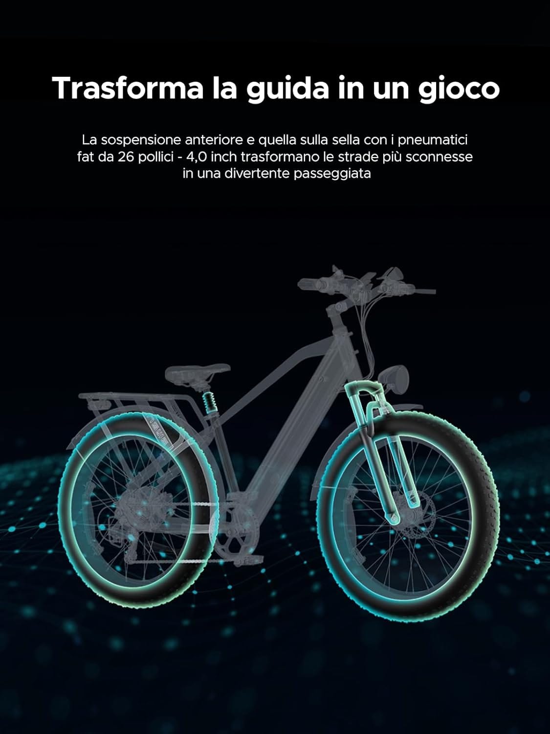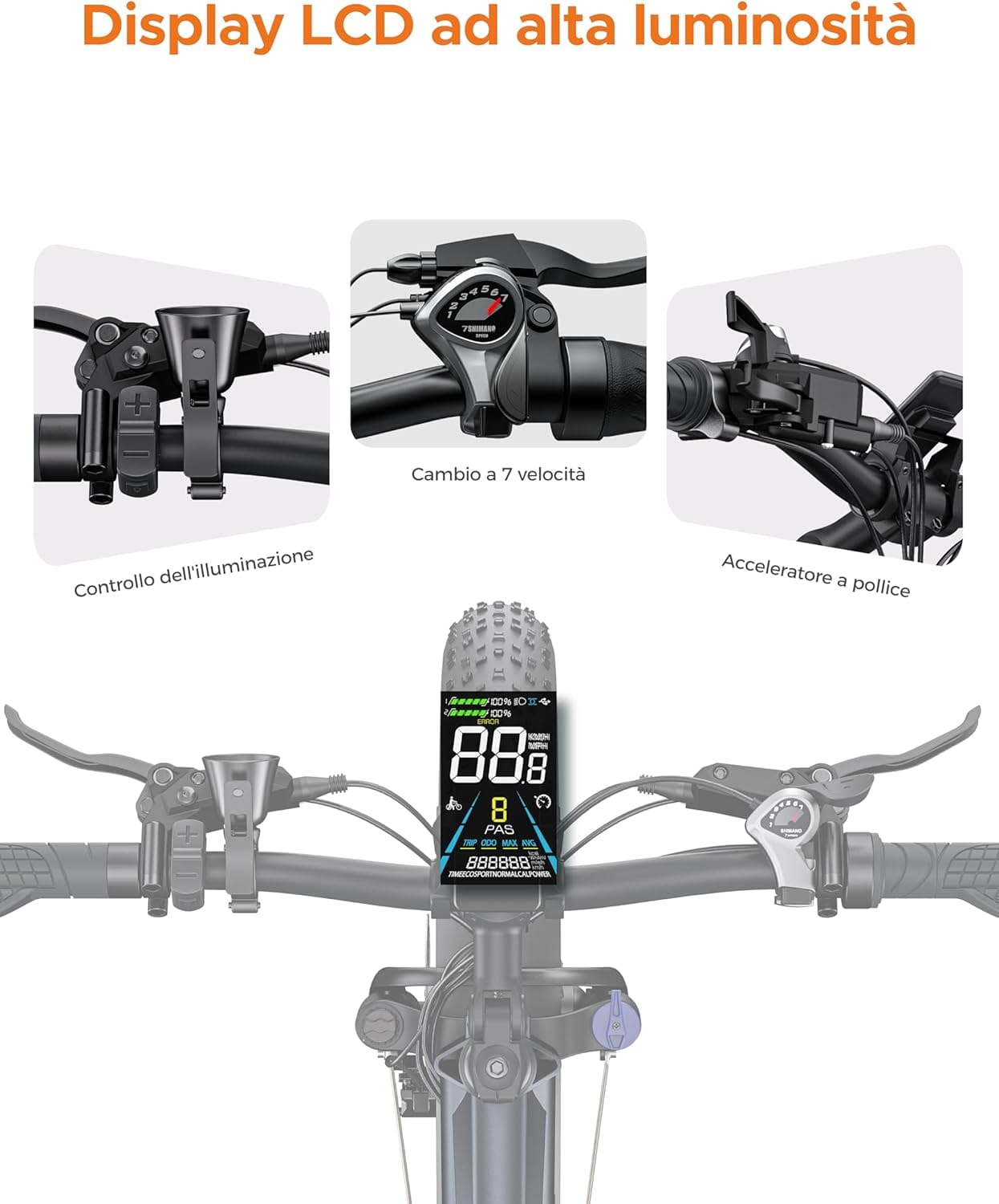 - L'adozione di pneumatici grassi da 26*4 pollici, può facilmente affrontare terreni estremi, e gli pneumatici antiforatura garantiscono la durata. Le doppie sospensioni ad alta resistenza, il cambio a 7 velocità, le luci anteriori e posteriori, il display LCD, i freni ad olio anteriori e posteriori rendono la guida più confortevole, l'e-bike può adattarsi alle condizioni stradali complesse per garantire la vostra sicurezza.
