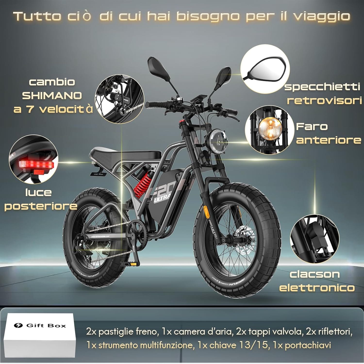 - ✅1* Bicicletta elettrica Fafrees F20 ULTRA 1* Caricabatterie 1* Manuale d'uso 2* Pedali 2* Specchietti retrovisori 1* Confezione regalo (include 2* pastiglie freno, 1* camera d'aria, 2* tappi valvola, 2* catarifrangenti, 1* attrezzo multifunzione, 1* chiave inglese da 13/15 e 1* portachiavi)