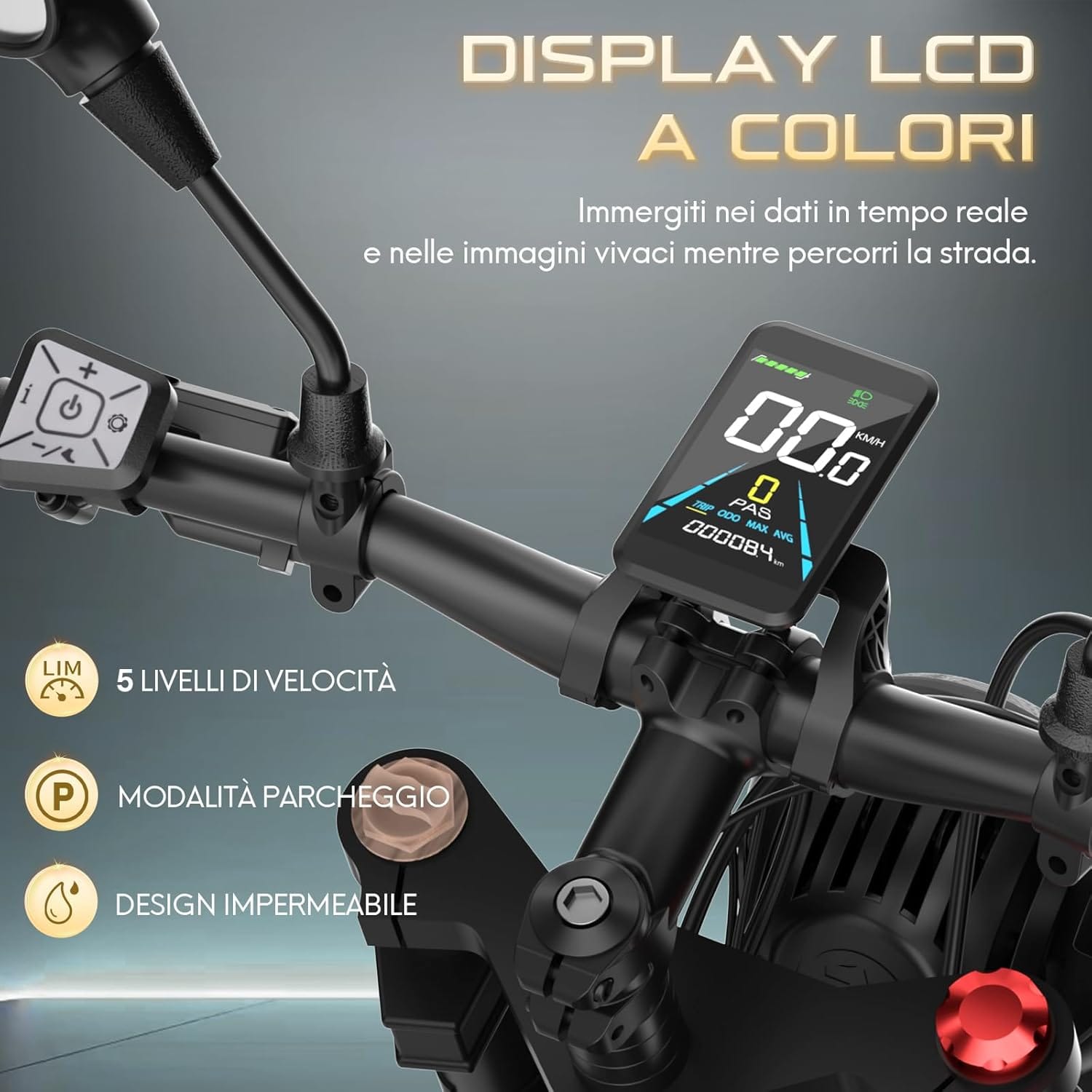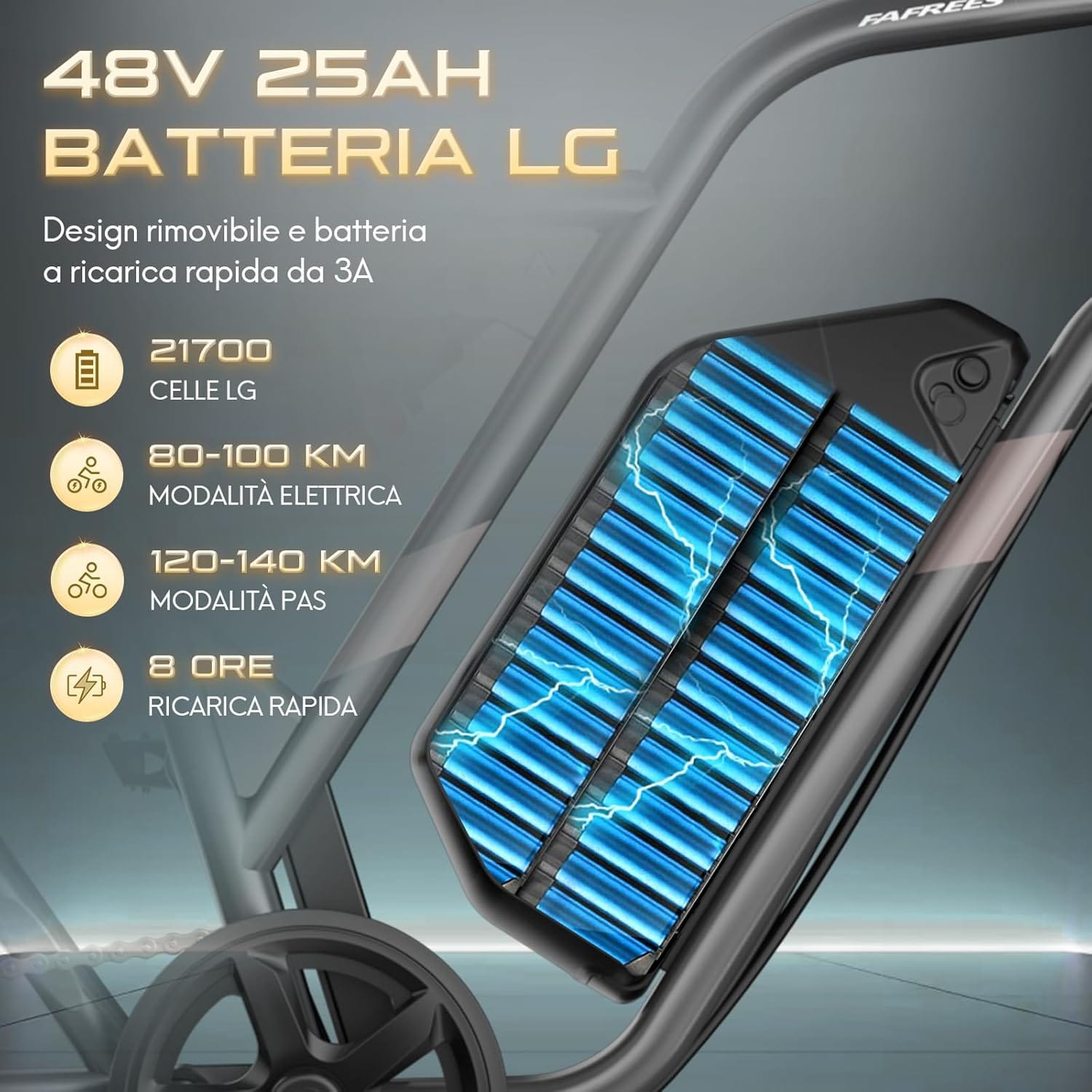 - 🔋La batteria da 48 V 25 Ah offre un'autonomia impressionante di 100 km in modalità elettrica e 120-140 km in modalità PAS, perfetta per i tragitti lunghi o le escursioni avventurose. Dotata di 21700 celle, la batteria è progettata per un'elevata efficienza, è rimovibile per maggiore praticità e supporta la ricarica rapida da 3 A, raggiungendo la carica completa in sole 8 ore.