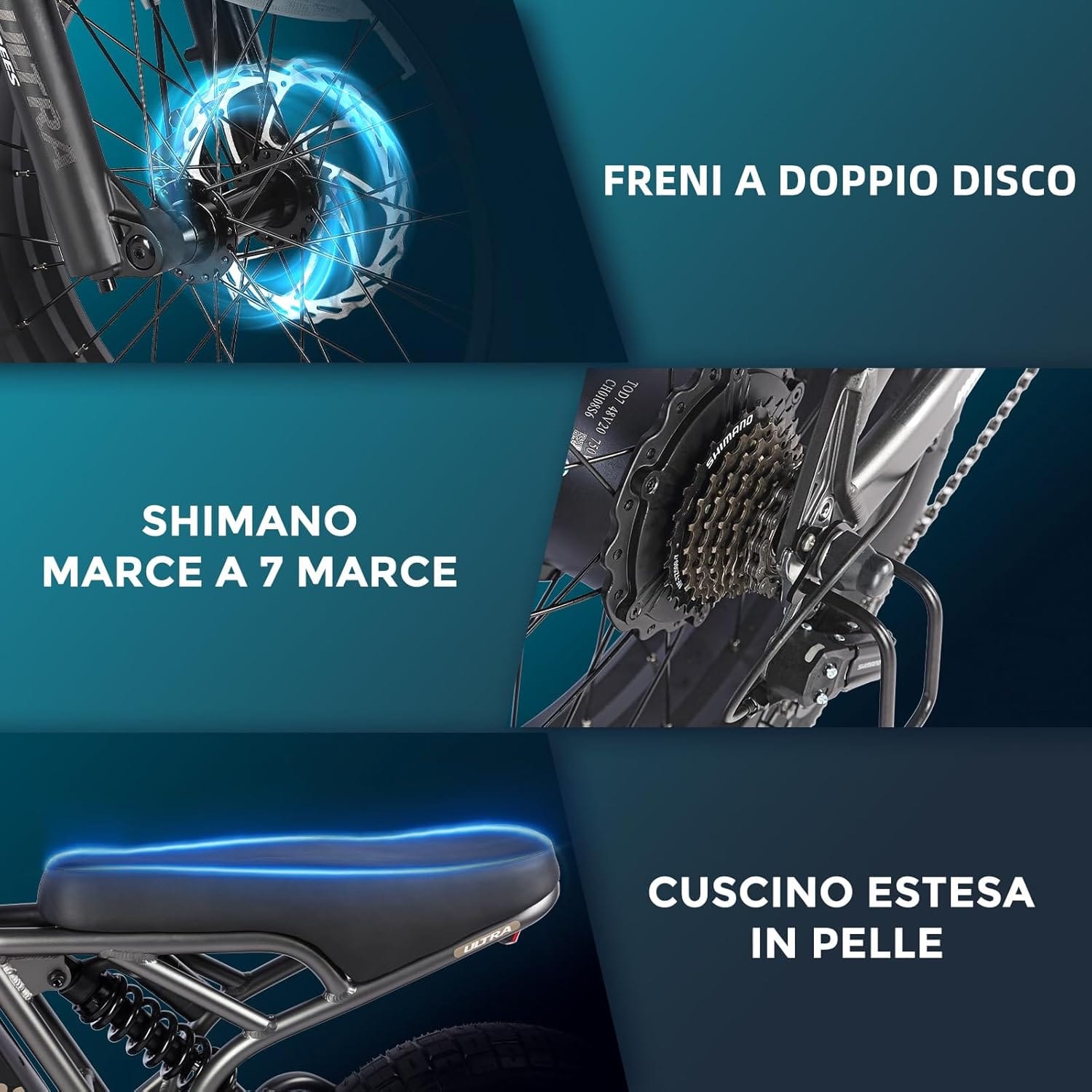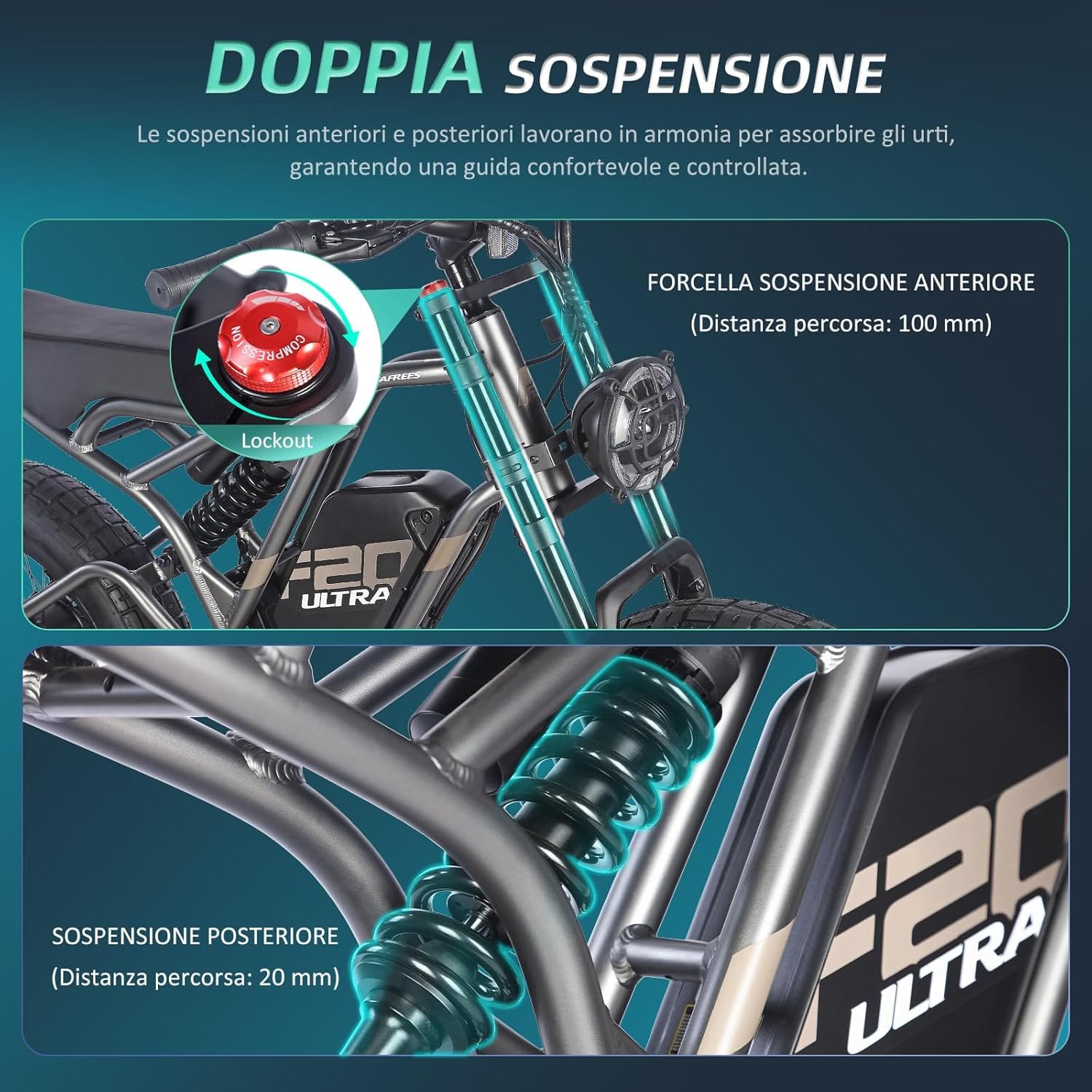 - 🚲Il sistema di sospensione doppia della mountain ebike è perfettamente integrato nel telaio e riduce le asperità. Regolate le sospensioni in base al vostro stile di guida con le manopole di bloccaggio. Il sistema a doppio disco della e-bike assicura una risposta veloce e affidabile con una reazione immediata in frenata.