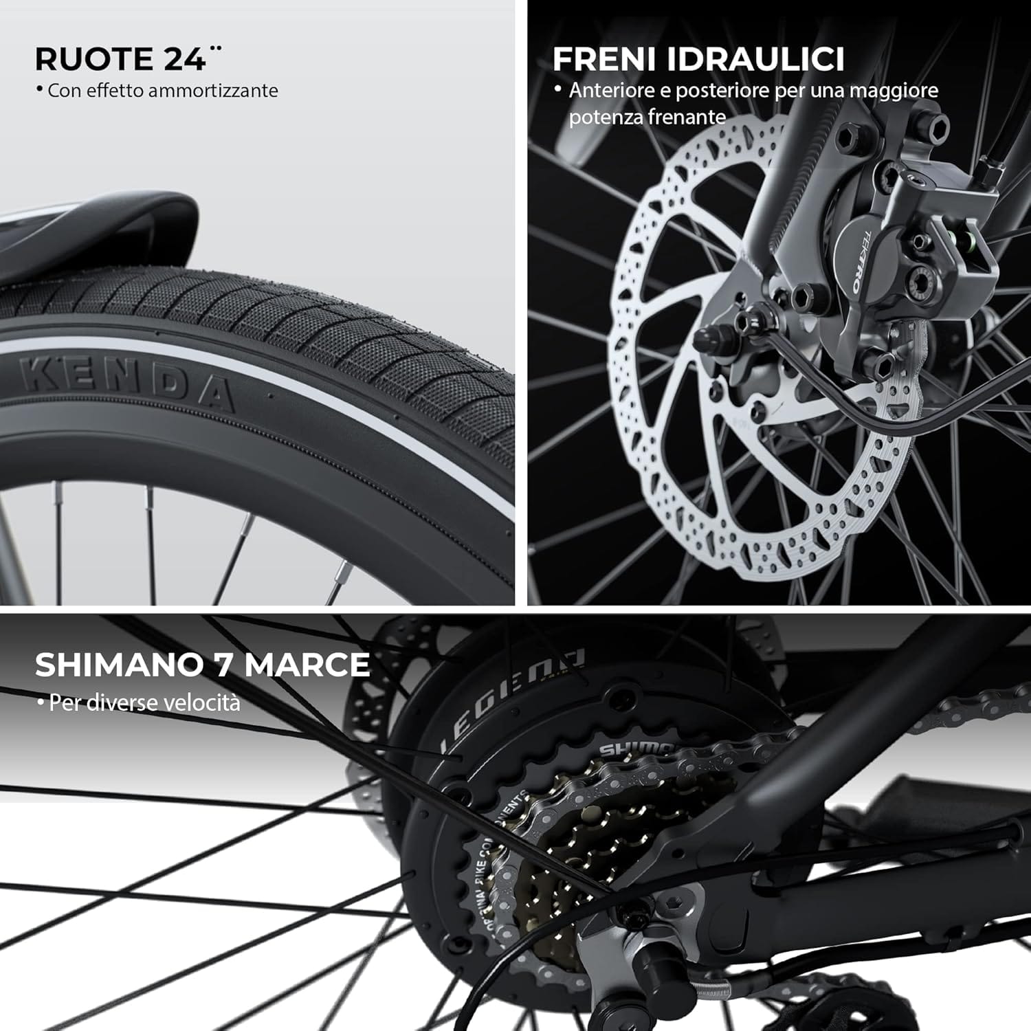 - SENZA LIMITI ALLE DISTANZE - Bici elettrica pieghevole per adulto con batteria rimovibile per percorrere fino a 90 km. Pneumatici grandi da 24" con effetto sospensione, freni a disco idraulici e cambio Shimano a 7 velocità. Telaio in alluminio rinforzato per garantire la massima resistenza.