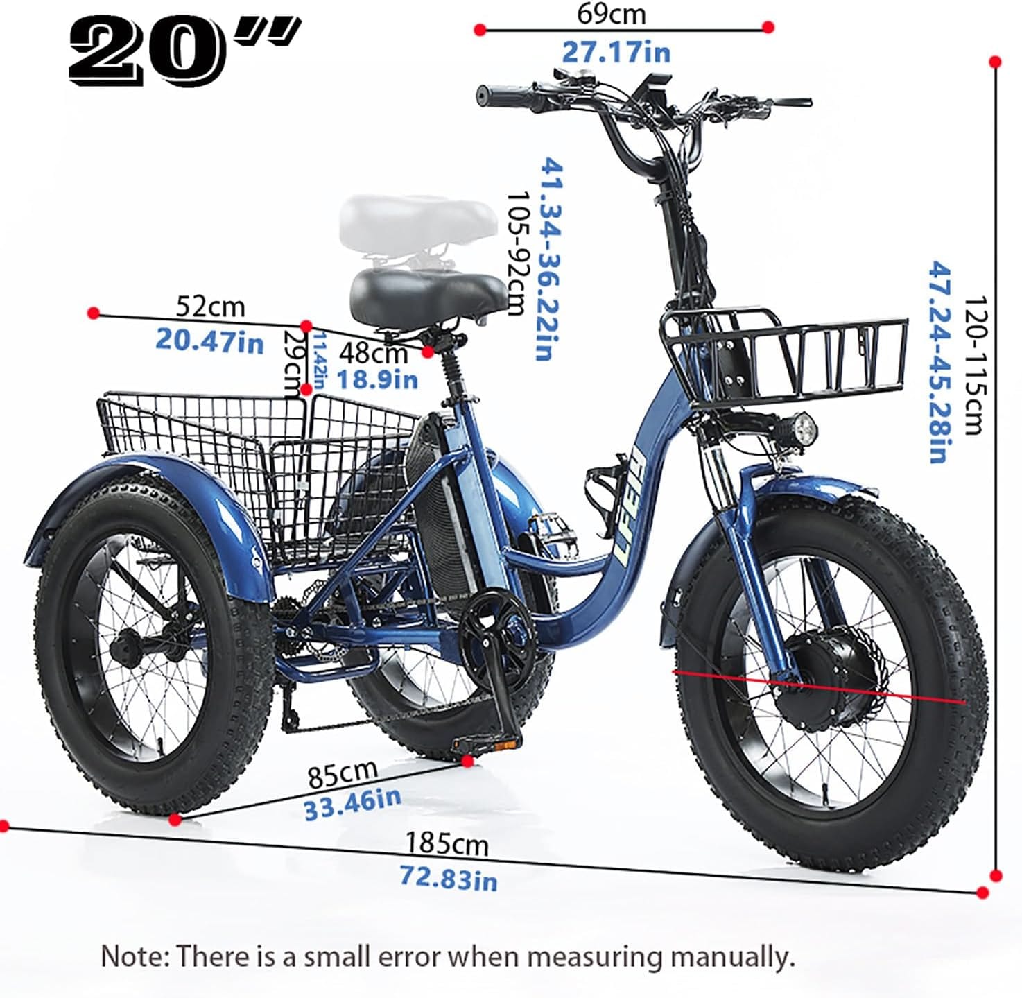 - 4️⃣Adatto a ciclisti da 130 cm a 185 cm, questo triciclo elettrico è dotato di sella, manubrio e tubo sella regolabili per una vestibilità personalizzata. I cerchi in alluminio da 20 pollici offrono equilibrio, trazione e curve fluide in ogni situazione.